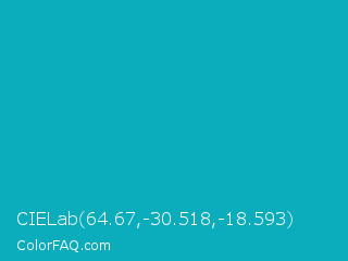 CIELab 64.67,-30.518,-18.593 Color is a normal cyan color and the nearest color is Tiffany Blue #0abab5. Hex code #0badbd and RGB value is rgb(11,173,189). In RGB color space, this color is composed of 4% red, 68% green, 74% blue, In CMYK color space, this color is composed of 94% cyan, 8% magenta, 0% yellow , 26% black , In HSL color space, this color has a hue angle of 185° , 89% saturation and 39% lightness.