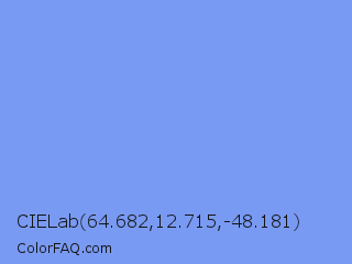 CIELab 64.682,12.715,-48.181 Color is a light blue color and the nearest color is Portage #8b9fee. Hex code #799af3 and RGB value is rgb(121,154,243). In RGB color space, this color is composed of 47% red, 60% green, 95% blue, In CMYK color space, this color is composed of 50% cyan, 37% magenta, 0% yellow , 5% black , In HSL color space, this color has a hue angle of 224° , 84% saturation and 71% lightness.