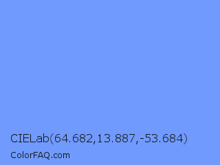 CIELab 64.682,13.887,-53.684 Color is a light blue color and the nearest color is Cornflower Blue #6495ed. Hex code #709afd and RGB value is rgb(112,154,253). In RGB color space, this color is composed of 44% red, 60% green, 99% blue, In CMYK color space, this color is composed of 56% cyan, 39% magenta, 0% yellow , 1% black , In HSL color space, this color has a hue angle of 222° , 97% saturation and 72% lightness.