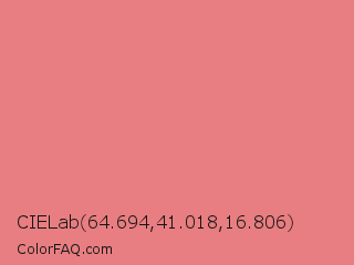 CIELab 64.694,41.018,16.806 Color is a light red color and the nearest color is Light Coral #f08080. Hex code #e87e81 and RGB value is rgb(232,126,129). In RGB color space, this color is composed of 91% red, 49% green, 51% blue, In CMYK color space, this color is composed of 0% cyan, 46% magenta, 44% yellow , 9% black , In HSL color space, this color has a hue angle of 358° , 70% saturation and 70% lightness.