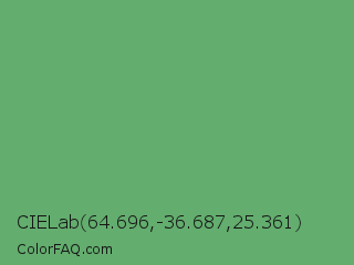 CIELab 64.696,-36.687,25.361 Color is a normal green color and the nearest color is Fern #63b76c. Hex code #63ad6e and RGB value is rgb(99,173,110). In RGB color space, this color is composed of 39% red, 68% green, 43% blue, In CMYK color space, this color is composed of 43% cyan, 0% magenta, 36% yellow , 32% black , In HSL color space, this color has a hue angle of 129° , 31% saturation and 53% lightness.