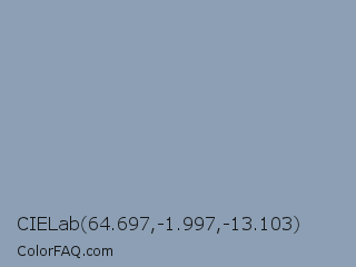 CIELab 64.697,-1.997,-13.103 Color is a light blue color and the nearest color is Cadet Grey #91a3b0. Hex code #8c9fb4 and RGB value is rgb(140,159,180). In RGB color space, this color is composed of 55% red, 62% green, 71% blue, In CMYK color space, this color is composed of 22% cyan, 12% magenta, 0% yellow , 29% black , In HSL color space, this color has a hue angle of 212° , 21% saturation and 63% lightness.