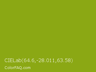 CIELab 64.6,-28.011,63.58 Color is a normal lime color and the nearest color is Citron #9fa91f. Hex code #8ba814 and RGB value is rgb(139,168,20). In RGB color space, this color is composed of 55% red, 66% green, 8% blue, In CMYK color space, this color is composed of 17% cyan, 0% magenta, 88% yellow , 34% black , In HSL color space, this color has a hue angle of 72° , 79% saturation and 37% lightness.