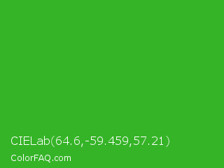 CIELab 64.6,-59.459,57.21 Color is a normal green color and the nearest color is Wageningen Green #34b233. Hex code #35b427 and RGB value is rgb(53,180,39). In RGB color space, this color is composed of 21% red, 71% green, 15% blue, In CMYK color space, this color is composed of 71% cyan, 0% magenta, 78% yellow , 29% black , In HSL color space, this color has a hue angle of 114° , 64% saturation and 43% lightness.