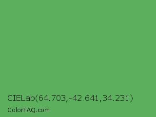 CIELab 64.703,-42.641,34.231 Color is a normal green color and the nearest color is Fern #63b76c. Hex code #5baf5d and RGB value is rgb(91,175,93). In RGB color space, this color is composed of 36% red, 69% green, 36% blue, In CMYK color space, this color is composed of 48% cyan, 0% magenta, 47% yellow , 31% black , In HSL color space, this color has a hue angle of 121° , 34% saturation and 52% lightness.