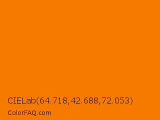CIELab 64.718,42.688,72.053 Color is a normal orange color and the nearest color is Chilean Fire #f77703. Hex code #f77a00 and RGB value is rgb(247,122,0). In RGB color space, this color is composed of 97% red, 48% green, 0% blue, In CMYK color space, this color is composed of 0% cyan, 51% magenta, 100% yellow , 3% black , In HSL color space, this color has a hue angle of 30° , 100% saturation and 48% lightness.