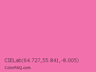 CIELab 64.727,55.841,-8.005 Color is a light rose color and the nearest color is Cyclamen #f56fa1. Hex code #f271ad and RGB value is rgb(242,113,173). In RGB color space, this color is composed of 95% red, 44% green, 68% blue, In CMYK color space, this color is composed of 0% cyan, 53% magenta, 29% yellow , 5% black , In HSL color space, this color has a hue angle of 332° , 83% saturation and 70% lightness.