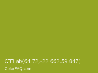 CIELab 64.72,-22.662,59.847 Color is a normal yellow color and the nearest color is Citron #9fa91f. Hex code #94a624 and RGB value is rgb(148,166,36). In RGB color space, this color is composed of 58% red, 65% green, 14% blue, In CMYK color space, this color is composed of 11% cyan, 0% magenta, 78% yellow , 35% black , In HSL color space, this color has a hue angle of 68° , 64% saturation and 40% lightness.