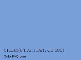 CIELab 64.72,1.381,-32.686 Color is a light blue color and the nearest color is Vista Blue #7c9ed9. Hex code #789fd7 and RGB value is rgb(120,159,215). In RGB color space, this color is composed of 47% red, 62% green, 84% blue, In CMYK color space, this color is composed of 44% cyan, 26% magenta, 0% yellow , 16% black , In HSL color space, this color has a hue angle of 215° , 54% saturation and 66% lightness.