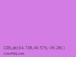 CIELab 64.738,49.579,-39.281 Color is a light purple color and the nearest color is French Mauve #d473d4. Hex code #d27ce4 and RGB value is rgb(210,124,228). In RGB color space, this color is composed of 82% red, 49% green, 89% blue, In CMYK color space, this color is composed of 8% cyan, 46% magenta, 0% yellow , 11% black , In HSL color space, this color has a hue angle of 290° , 66% saturation and 69% lightness.