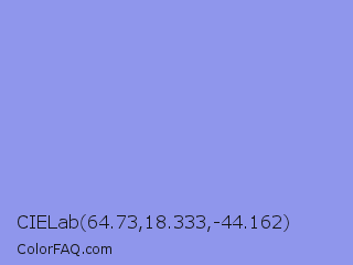 CIELab 64.73,18.333,-44.162 Color is a light blue color and the nearest color is Portage #8b9fee. Hex code #8f96ec and RGB value is rgb(143,150,236). In RGB color space, this color is composed of 56% red, 59% green, 93% blue, In CMYK color space, this color is composed of 39% cyan, 36% magenta, 0% yellow , 7% black , In HSL color space, this color has a hue angle of 235° , 71% saturation and 74% lightness.