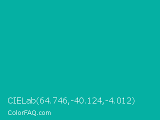 CIELab 64.746,-40.124,-4.012 Color is a normal cyan color and the nearest color is Persian Green #00a693. Hex code #05b0a3 and RGB value is rgb(5,176,163). In RGB color space, this color is composed of 2% red, 69% green, 64% blue, In CMYK color space, this color is composed of 97% cyan, 0% magenta, 7% yellow , 31% black , In HSL color space, this color has a hue angle of 175° , 94% saturation and 35% lightness.
