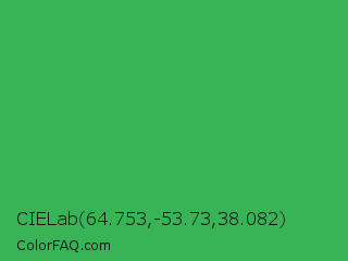 CIELab 64.753,-53.73,38.082 Color is a normal green color and the nearest color is Chateau Green #40a860. Hex code #38b355 and RGB value is rgb(56,179,85). In RGB color space, this color is composed of 22% red, 70% green, 33% blue, In CMYK color space, this color is composed of 69% cyan, 0% magenta, 53% yellow , 30% black , In HSL color space, this color has a hue angle of 134° , 52% saturation and 46% lightness.