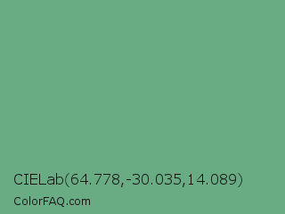 CIELab 64.778,-30.035,14.089 Color is a normal green color and the nearest color is Shiny Shamrock #5fa778. Hex code #69ab83 and RGB value is rgb(105,171,131). In RGB color space, this color is composed of 41% red, 67% green, 51% blue, In CMYK color space, this color is composed of 39% cyan, 0% magenta, 23% yellow , 33% black , In HSL color space, this color has a hue angle of 144° , 28% saturation and 54% lightness.