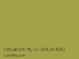 CIELab 64.78,-11.254,44.836 Color is a normal yellow color and the nearest color is Brass #b5a642. Hex code #a3a14a and RGB value is rgb(163,161,74). In RGB color space, this color is composed of 64% red, 63% green, 29% blue, In CMYK color space, this color is composed of 0% cyan, 1% magenta, 55% yellow , 36% black , In HSL color space, this color has a hue angle of 59° , 38% saturation and 46% lightness.