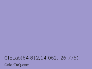 CIELab 64.812,14.062,-26.775 Color is a light indigo color and the nearest color is Blue Bell Crayola #9999cc. Hex code #9e97cd and RGB value is rgb(158,151,205). In RGB color space, this color is composed of 62% red, 59% green, 80% blue, In CMYK color space, this color is composed of 23% cyan, 26% magenta, 0% yellow , 20% black , In HSL color space, this color has a hue angle of 248° , 35% saturation and 70% lightness.