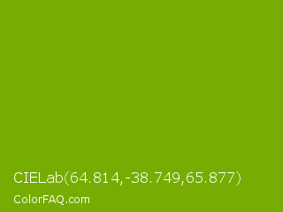 CIELab 64.814,-38.749,65.877 Color is a normal lime color and the nearest color is Limeade #6f9d02. Hex code #77ad02 and RGB value is rgb(119,173,2). In RGB color space, this color is composed of 47% red, 68% green, 1% blue, In CMYK color space, this color is composed of 31% cyan, 0% magenta, 99% yellow , 32% black , In HSL color space, this color has a hue angle of 79° , 98% saturation and 34% lightness.
