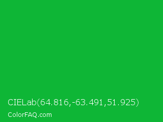CIELab 64.816,-63.491,51.925 Color is a normal green color and the nearest color is Dark Pastel Green #03c03c. Hex code #0eb636 and RGB value is rgb(14,182,54). In RGB color space, this color is composed of 5% red, 71% green, 21% blue, In CMYK color space, this color is composed of 92% cyan, 0% magenta, 70% yellow , 29% black , In HSL color space, this color has a hue angle of 134° , 86% saturation and 38% lightness.