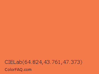 CIELab 64.824,43.761,47.373 Color is a light orange color and the nearest color is Mandarin #f37a48. Hex code #f57a4a and RGB value is rgb(245,122,74). In RGB color space, this color is composed of 96% red, 48% green, 29% blue, In CMYK color space, this color is composed of 0% cyan, 50% magenta, 70% yellow , 4% black , In HSL color space, this color has a hue angle of 17° , 90% saturation and 63% lightness.