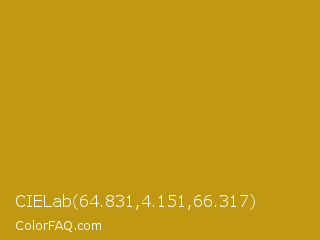 CIELab 64.831,4.151,66.317 Color is a normal yellow color and the nearest color is Pizza #c99415. Hex code #c19811 and RGB value is rgb(193,152,17). In RGB color space, this color is composed of 76% red, 60% green, 7% blue, In CMYK color space, this color is composed of 0% cyan, 21% magenta, 91% yellow , 24% black , In HSL color space, this color has a hue angle of 46° , 84% saturation and 41% lightness.