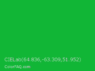 CIELab 64.836,-63.309,51.952 Color is a normal green color and the nearest color is Dark Pastel Green #03c03c. Hex code #11b636 and RGB value is rgb(17,182,54). In RGB color space, this color is composed of 7% red, 71% green, 21% blue, In CMYK color space, this color is composed of 91% cyan, 0% magenta, 70% yellow , 29% black , In HSL color space, this color has a hue angle of 133° , 83% saturation and 39% lightness.