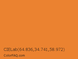 CIELab 64.836,34.741,58.972 Color is a normal orange color and the nearest color is Cadmium Orange #ed872d. Hex code #eb8230 and RGB value is rgb(235,130,48). In RGB color space, this color is composed of 92% red, 51% green, 19% blue, In CMYK color space, this color is composed of 0% cyan, 45% magenta, 80% yellow , 8% black , In HSL color space, this color has a hue angle of 26° , 82% saturation and 55% lightness.