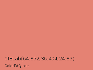 CIELab 64.852,36.494,24.83 Color is a light red color and the nearest color is Middle Red #e58e73. Hex code #e58273 and RGB value is rgb(229,130,115). In RGB color space, this color is composed of 90% red, 51% green, 45% blue, In CMYK color space, this color is composed of 0% cyan, 43% magenta, 50% yellow , 10% black , In HSL color space, this color has a hue angle of 8° , 69% saturation and 67% lightness.