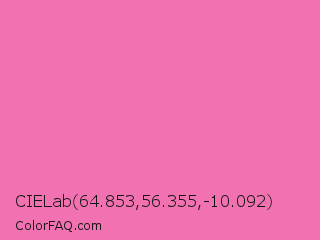 CIELab 64.853,56.355,-10.092 Color is a light rose color and the nearest color is Hot Pink #ff69b4. Hex code #f271b1 and RGB value is rgb(242,113,177). In RGB color space, this color is composed of 95% red, 44% green, 69% blue, In CMYK color space, this color is composed of 0% cyan, 53% magenta, 27% yellow , 5% black , In HSL color space, this color has a hue angle of 330° , 83% saturation and 70% lightness.