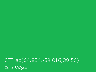 CIELab 64.854,-59.016,39.56 Color is a normal green color and the nearest color is Green Pigment #00a550. Hex code #19b552 and RGB value is rgb(25,181,82). In RGB color space, this color is composed of 10% red, 71% green, 32% blue, In CMYK color space, this color is composed of 86% cyan, 0% magenta, 55% yellow , 29% black , In HSL color space, this color has a hue angle of 142° , 76% saturation and 40% lightness.