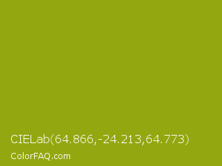 CIELab 64.866,-24.213,64.773 Color is a normal yellow color and the nearest color is Citron #9fa91f. Hex code #93a710 and RGB value is rgb(147,167,16). In RGB color space, this color is composed of 58% red, 65% green, 6% blue, In CMYK color space, this color is composed of 12% cyan, 0% magenta, 90% yellow , 35% black , In HSL color space, this color has a hue angle of 68° , 83% saturation and 36% lightness.