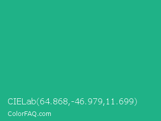 CIELab 64.868,-46.979,11.699 Color is a normal green color and the nearest color is Mountain Meadow Crayola #1ab385. Hex code #1fb287 and RGB value is rgb(31,178,135). In RGB color space, this color is composed of 12% red, 70% green, 53% blue, In CMYK color space, this color is composed of 83% cyan, 0% magenta, 24% yellow , 30% black , In HSL color space, this color has a hue angle of 162° , 70% saturation and 41% lightness.