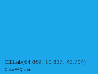 CIELab 64.869,-10.837,-43.704 Color is a normal blue color and the nearest color is Button Blue #24a0ed. Hex code #1ca7eb and RGB value is rgb(28,167,235). In RGB color space, this color is composed of 11% red, 65% green, 92% blue, In CMYK color space, this color is composed of 88% cyan, 29% magenta, 0% yellow , 8% black , In HSL color space, this color has a hue angle of 200° , 84% saturation and 52% lightness.