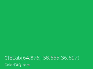 CIELab 64.876,-58.555,36.617 Color is a normal green color and the nearest color is GO Green #00ab66. Hex code #13b558 and RGB value is rgb(19,181,88). In RGB color space, this color is composed of 7% red, 71% green, 35% blue, In CMYK color space, this color is composed of 90% cyan, 0% magenta, 51% yellow , 29% black , In HSL color space, this color has a hue angle of 146° , 81% saturation and 39% lightness.