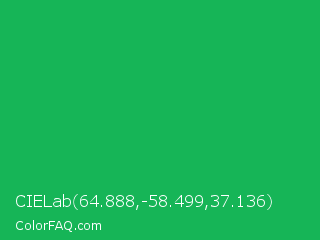 CIELab 64.888,-58.499,37.136 Color is a normal green color and the nearest color is Green Pigment #00a550. Hex code #16b557 and RGB value is rgb(22,181,87). In RGB color space, this color is composed of 9% red, 71% green, 34% blue, In CMYK color space, this color is composed of 88% cyan, 0% magenta, 52% yellow , 29% black , In HSL color space, this color has a hue angle of 145° , 78% saturation and 40% lightness.