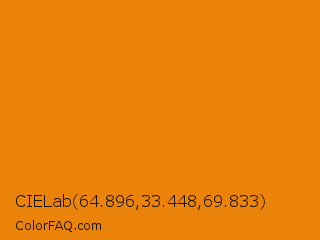 CIELab 64.896,33.448,69.833 Color is a normal orange color and the nearest color is Tahiti Gold #e97c07. Hex code #eb830a and RGB value is rgb(235,131,10). In RGB color space, this color is composed of 92% red, 51% green, 4% blue, In CMYK color space, this color is composed of 0% cyan, 44% magenta, 96% yellow , 8% black , In HSL color space, this color has a hue angle of 32° , 92% saturation and 48% lightness.