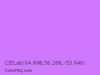 CIELab 64.898,56.268,-53.946 Color is a light purple color and the nearest color is Heliotrope #df73ff. Hex code #cf78ff and RGB value is rgb(207,120,255). In RGB color space, this color is composed of 81% red, 47% green, 100% blue, In CMYK color space, this color is composed of 19% cyan, 53% magenta, 0% yellow , 0% black , In HSL color space, this color has a hue angle of 279° , 100% saturation and 74% lightness.