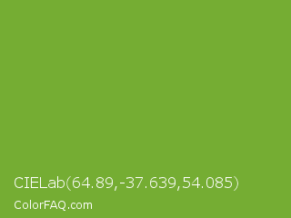 CIELab 64.89,-37.639,54.085 Color is a normal green color and the nearest color is Green RYB #66b032. Hex code #75ad33 and RGB value is rgb(117,173,51). In RGB color space, this color is composed of 46% red, 68% green, 20% blue, In CMYK color space, this color is composed of 32% cyan, 0% magenta, 71% yellow , 32% black , In HSL color space, this color has a hue angle of 88° , 54% saturation and 44% lightness.