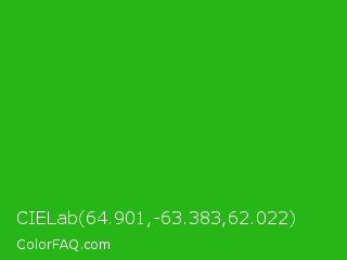 CIELab 64.901,-63.383,62.022 Color is a normal green color and the nearest color is Slimy Green #299617. Hex code #26b615 and RGB value is rgb(38,182,21). In RGB color space, this color is composed of 15% red, 71% green, 8% blue, In CMYK color space, this color is composed of 79% cyan, 0% magenta, 88% yellow , 29% black , In HSL color space, this color has a hue angle of 114° , 79% saturation and 40% lightness.