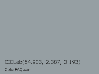 CIELab 64.903,-2.387,-3.193 Color is a light blue color and the nearest color is Manatee #979aaa. Hex code #969fa3 and RGB value is rgb(150,159,163). In RGB color space, this color is composed of 59% red, 62% green, 64% blue, In CMYK color space, this color is composed of 8% cyan, 2% magenta, 0% yellow , 36% black , In HSL color space, this color has a hue angle of 198° , 7% saturation and 61% lightness.