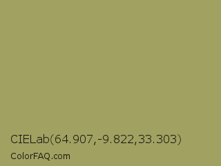 CIELab 64.907,-9.822,33.303 Color is a normal yellow color and the nearest color is Green Smoke #a4af6e. Hex code #a1a161 and RGB value is rgb(161,161,97). In RGB color space, this color is composed of 63% red, 63% green, 38% blue, In CMYK color space, this color is composed of 0% cyan, 0% magenta, 40% yellow , 37% black , In HSL color space, this color has a hue angle of 60° , 25% saturation and 51% lightness.
