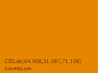 CIELab 64.908,31.087,71.108 Color is a normal orange color and the nearest color is Fulvous #e48400. Hex code #e88500 and RGB value is rgb(232,133,0). In RGB color space, this color is composed of 91% red, 52% green, 0% blue, In CMYK color space, this color is composed of 0% cyan, 43% magenta, 100% yellow , 9% black , In HSL color space, this color has a hue angle of 34° , 100% saturation and 45% lightness.