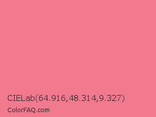 CIELab 64.916,48.314,9.327 Color is a light red color and the nearest color is Froly #f57584. Hex code #f0788f and RGB value is rgb(240,120,143). In RGB color space, this color is composed of 94% red, 47% green, 56% blue, In CMYK color space, this color is composed of 0% cyan, 50% magenta, 40% yellow , 6% black , In HSL color space, this color has a hue angle of 349° , 80% saturation and 71% lightness.