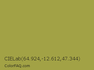 CIELab 64.924,-12.612,47.344 Color is a normal yellow color and the nearest color is Brass #b5a642. Hex code #a2a245 and RGB value is rgb(162,162,69). In RGB color space, this color is composed of 64% red, 64% green, 27% blue, In CMYK color space, this color is composed of 0% cyan, 0% magenta, 57% yellow , 36% black , In HSL color space, this color has a hue angle of 60° , 40% saturation and 45% lightness.