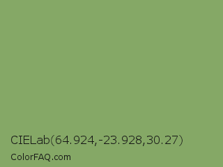 CIELab 64.924,-23.928,30.27 Color is a normal green color and the nearest color is Asparagus #87a96b. Hex code #85a866 and RGB value is rgb(133,168,102). In RGB color space, this color is composed of 52% red, 66% green, 40% blue, In CMYK color space, this color is composed of 21% cyan, 0% magenta, 39% yellow , 34% black , In HSL color space, this color has a hue angle of 92° , 28% saturation and 53% lightness.