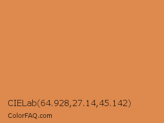 CIELab 64.928,27.14,45.142 Color is a normal orange color and the nearest color is Persian Orange #d99058. Hex code #de894d and RGB value is rgb(222,137,77). In RGB color space, this color is composed of 87% red, 54% green, 30% blue, In CMYK color space, this color is composed of 0% cyan, 38% magenta, 65% yellow , 13% black , In HSL color space, this color has a hue angle of 25° , 69% saturation and 59% lightness.