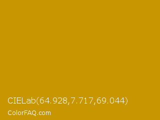 CIELab 64.928,7.717,69.044 Color is a normal orange color and the nearest color is Vivid Amber #cc9900. Hex code #c79601 and RGB value is rgb(199,150,1). In RGB color space, this color is composed of 78% red, 59% green, 0% blue, In CMYK color space, this color is composed of 0% cyan, 25% magenta, 99% yellow , 22% black , In HSL color space, this color has a hue angle of 45° , 99% saturation and 39% lightness.
