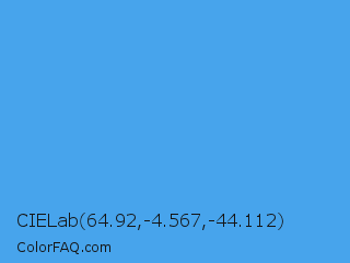 CIELab 64.92,-4.567,-44.112 Color is a normal blue color and the nearest color is Picton Blue #45b1e8. Hex code #47a4ec and RGB value is rgb(71,164,236). In RGB color space, this color is composed of 28% red, 64% green, 93% blue, In CMYK color space, this color is composed of 70% cyan, 31% magenta, 0% yellow , 7% black , In HSL color space, this color has a hue angle of 206° , 81% saturation and 60% lightness.