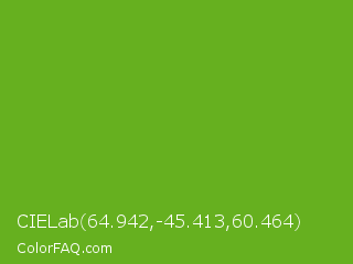 CIELab 64.942,-45.413,60.464 Color is a normal green color and the nearest color is Christi #67a712. Hex code #66b01f and RGB value is rgb(102,176,31). In RGB color space, this color is composed of 40% red, 69% green, 12% blue, In CMYK color space, this color is composed of 42% cyan, 0% magenta, 82% yellow , 31% black , In HSL color space, this color has a hue angle of 91° , 70% saturation and 41% lightness.