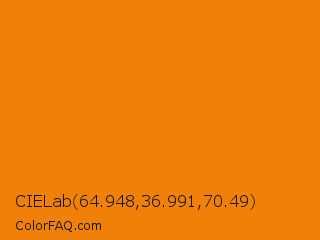 CIELab 64.948,36.991,70.49 Color is a normal orange color and the nearest color is Tahiti Gold #e97c07. Hex code #f08008 and RGB value is rgb(240,128,8). In RGB color space, this color is composed of 94% red, 50% green, 3% blue, In CMYK color space, this color is composed of 0% cyan, 47% magenta, 97% yellow , 6% black , In HSL color space, this color has a hue angle of 31° , 94% saturation and 49% lightness.