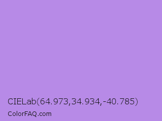 CIELab 64.973,34.934,-40.785 Color is a light violet color and the nearest color is Bright Lavender #bf94e4. Hex code #b78ae7 and RGB value is rgb(183,138,231). In RGB color space, this color is composed of 72% red, 54% green, 91% blue, In CMYK color space, this color is composed of 21% cyan, 40% magenta, 0% yellow , 9% black , In HSL color space, this color has a hue angle of 269° , 66% saturation and 72% lightness.